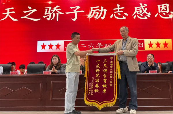 高三学子代表分享备考心得,言语间满是对父母、师长与学校的感恩之情,坚定表达未来在本科院校继续逐梦前行的决心。家长代表施梓阳登台,结合自身育儿经历畅谈感悟,衷心感谢学校与老师们的辛勤付出,寄语所有天之骄子学会感恩、勇于担当,祝愿学校再创高考辉煌。发言落幕,家长代表刘金伟代表全体家长,向学校赠送感恩锦旗,锦旗上真挚的话语承载着家长们对学校培育学子的深切谢意,也彰显了家校同心共育的深厚情谊,现场掌声雷动、暖意融融。