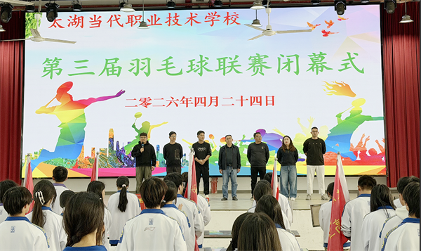 挥拍逐梦 不负韶华——我校第三届羽毛球赛圆满闭幕点击数:62026-04-25 来源:安徽太湖当代职业技术学校 汗水挥洒赛场,青春绽放光芒。历经46场的激烈角逐,我校第三届羽毛球联赛于4月24日落下帷幕。校领导、老师及各班运动员齐聚闭幕式现场,共同见证这场校园体育盛会的圆满收官。此次闭幕式由政教处副主任汪崇金主持。