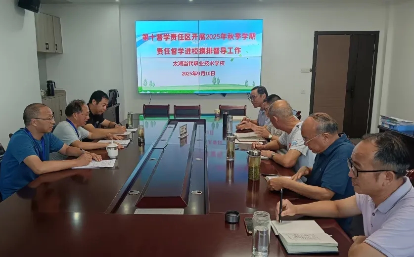 以查促建提升办学质量——太湖当代职业技术学校接受2025年秋季学期督导点击数:762025-09-11 来源:安徽太湖当代职业技术学校 9月10日,第十督学责任区督学组徐远游一行三人莅临太湖当代职业技术学校,开展2025年秋季学期专项督导工作,旨在全面掌握学校开学初期运行状况,推动学校规范管理与质量提升,学校相关领导全程陪同。