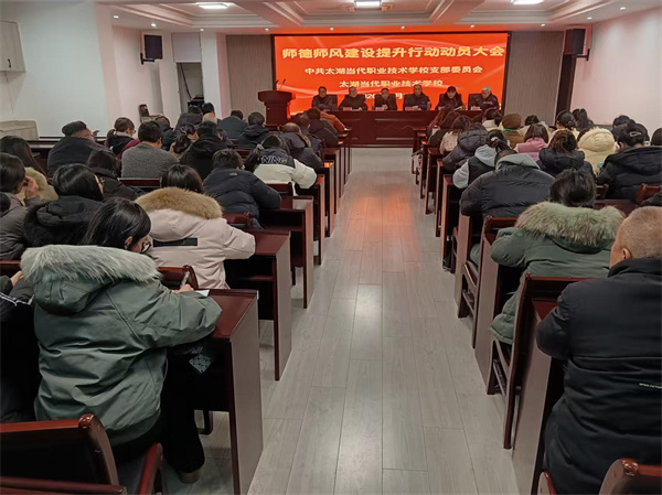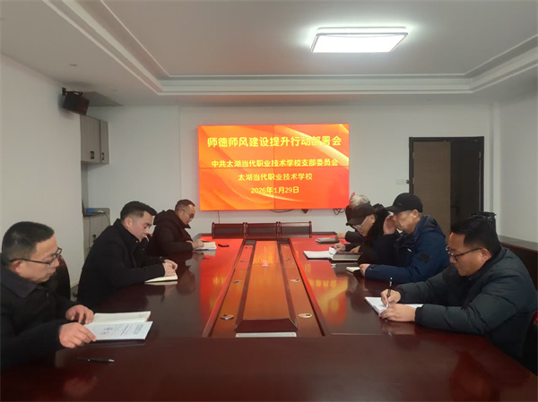 铸魂强师守初心 风清气正育新人——太湖当代职业技术学校召开师德师风建设提升行动动员大会点击数:1142026-01-31 来源:安徽太湖当代职业技术学校 为深入贯彻落实国家教育强国建设战略部署及太湖县师德师风建设工作要求,切实筑牢教师队伍思想道德根基,2026年1月30日,太湖当代职业技术学校召开全体员工会议,正式启动师德师风建设提升行动。会议由学校党支部书记李树国主持,全体教职员工参会,凝聚起"以德立身,以德施教"的思想共识与行动合力。 ![]()