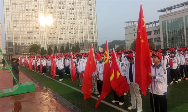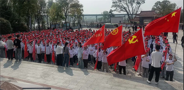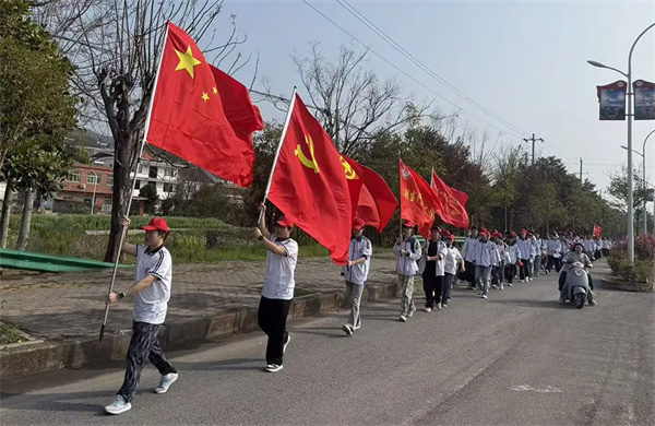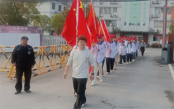 清晨,阳光灿烂,春风和煦,全体学生身着整齐的校服在校园集合。副校长唐国强对全体师生进行了细致的行前动员与安全纪律叮嘱。随着出发指令的下达,远足队伍有序启程,国旗、党旗、团旗、校旗、班旗高高飘扬,队伍声势浩大,全体师生迈着整齐的步伐,向着红色教育基地烈士陵园稳步前进。