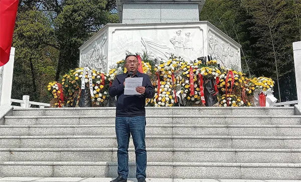 历经两小时的徒步跋涉,全体师生顺利抵达烈士陵园。踏入陵园,气氛瞬间变得庄重肃穆,苍松翠柏挺拔矗立,静静守护着长眠于此的革命先烈,墓碑上镌刻的名字,诉说着那段烽火连天的峥嵘岁月。祭扫活动按照既定流程有序推进:全体师生向烈士纪念碑敬献花圈,学生代表郑重整理花篮缎带,致以最深切的缅怀;随后,全体师生肃立默哀,以沉默寄托对英烈的无尽哀思。默哀毕,学生代表2406班张芸旗、教师代表李奇先后发言,字里行间满是对先烈的崇敬,也传递着以青春奋进前行的力量。党支部书记李树国作现场讲话,深刻阐释英烈精神的时代内涵,号召全体师生铭记历史、勇担使命。随后学生们自由参观陵园、感悟英烈事迹,最后在指定地点集合归队,踏上返程之路。
